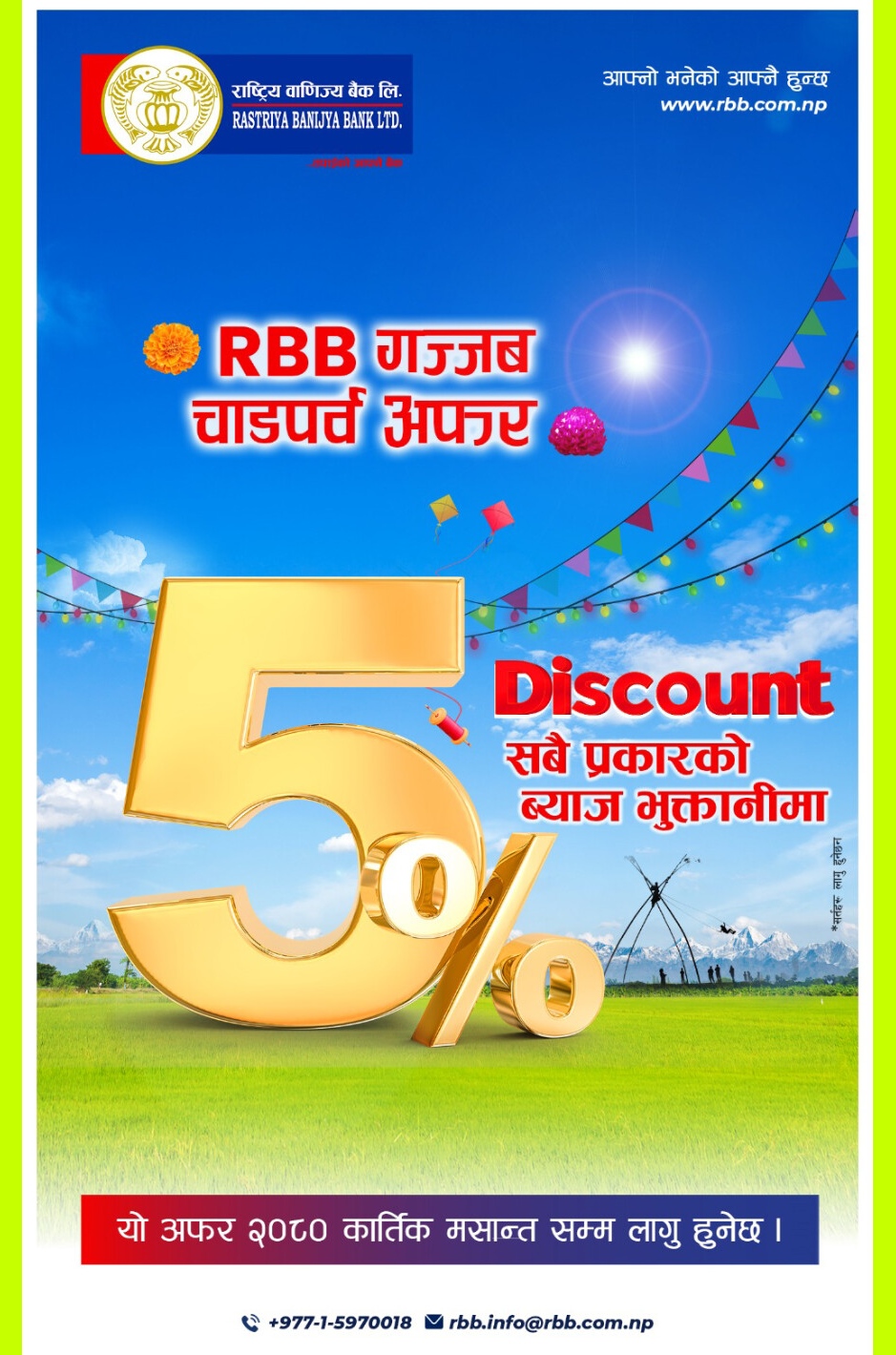 ३० असोज,काठमाडौं । राष्ट्रिय वाणिज्य बैंकले एक सुचना प्रकाशन गर्दै नेपालीहरुको महान् चाड बडा दशैं तथा शुभ दीपावली,न्यु दया भिन्तुना र छट पर्वको उपलक्ष्यमा ब्याज भुक्तानी गर्ने आफ्ना सम्पूर्ण ऋणीहरुलाई ५ प्रतिशत छुट दिने सुचना मार्फत जानकारी गराएको छ। बैंकले भुक्तानी गर्ने समय भने, २०८० कार्तिक मसान्ससम्म रहेको जनाएको छ। सुचनाको मुलभुत सार यस्तो छ —: