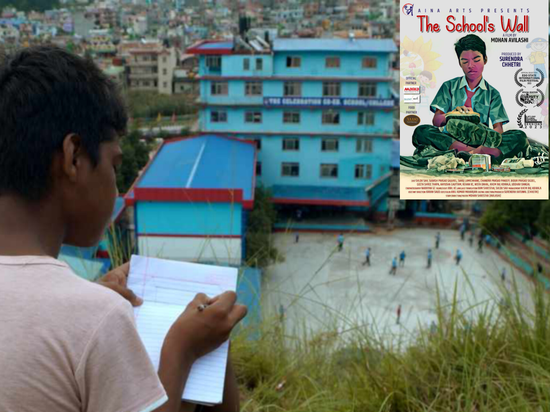 ‘द स्कुल वाल’ मा पर्खालको रुपमा गरिबी, परिस्थिति र जिम्मेवारीलाई प्रस्तुत गरिएको छ । लघुचलचित्रमा विद्यालय नजिकै जुत्ता पालिस गर्ने तराईको एक बालकको संघर्षको कथालाई प्रस्तुत गरिएको निर्माण पक्षले जनाएको छ । काम गर्ने ठाउँको अगाडिबाट विद्यार्थीहरु विद्यालय गईरहँदा उसलाई पनि पढ्ने रहरले विद्यालयसम्म तानेर लैजान्छ । पारिवारिक, आर्थिक समस्या र बाध्यात्मक परिस्थितिबिच उसले अनेक तरहका उपाएहरु अपनाएर विद्यालयभित्र प्रवेश गर्न सफल हुन्छ तर त्यो खुशी धेरै समय टिक्दैन र कथाले अर्कै मोड लिन्छ । एउटा बालकले पढ्ने रहरको लागि के के सम्म गर्न सक्छ भन्ने कुरालाई चलचित्रले देखाउन खोजेको यसका निर्माता सुरेन्द्र क्षेत्री बताउँछन् ।