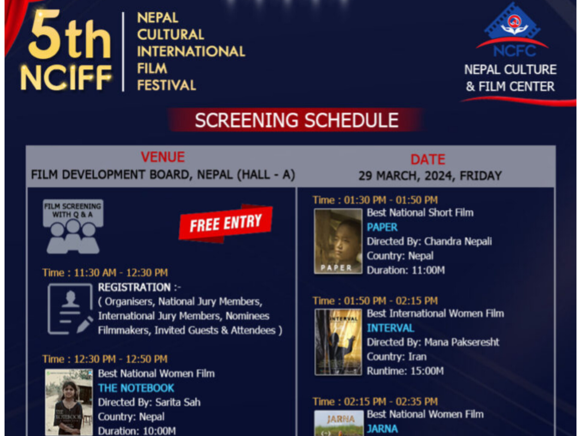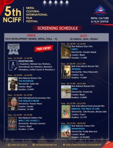 महोत्सवको आयोजक रहेको नेपाल संस्कृति तथा चलचित्र केन्द्रले महोत्सवको तालिकासमेत सार्वजनिक गरेको छ । महोत्सवमा नेपाली चलचित्र चिसो मान्छे, महापुरुष, छक्का पञ्जा ४ लगायत अन्य विभिन्न विधाका चलचित्रहरुका साथै विदेशी ३ दर्जनजति चलचित्रहरु समावेश भएका छन् । कुनै पनि चलचित्रहरु हेर्न पैसा नलाग्ने र कार्यक्रममा प्रवेश निःशुल्क रहेको जनाइएको छ । अन्य चलचित्र महोत्सवले प्रवेश शुल्क लिने गरेको तर यो महोत्सवमा कसैलाई पनि प्रवेश र चलचित्र हेर्न कुनै पैसा नलाग्ने भएको कारण सर्वसाधारण, विद्यार्थी, चलचित्रकर्मी लगायत सबैलाई समान रुपमा समेट्न सकिने आयोजक टीमले बताएको छ । मानव अधिकार, सामाजिक न्याय र दिगो विकासका विषयलाई केन्द्रमा राखेर चलचित्र महोत्सवको आयोजना गर्न लागिएको नेपाल संस्कृति तथा चलचित्र केन्द्र (एनसीएफसी) ले जनाएको छ । चलचित्र महोत्सवको अन्तीम दिन सात राष्ट्रिय तथा अन्तर्राष्ट्रिय निर्णायकहरुको मूल्यांकनको आधारमा महोत्सवमा सहभागी १५ स्वदेशी र १५ वटा विदेशी फरक फरक विधाका उत्कृष्ट फिल्महरुलाई पुरस्कृत समेत गरिनेछ ।